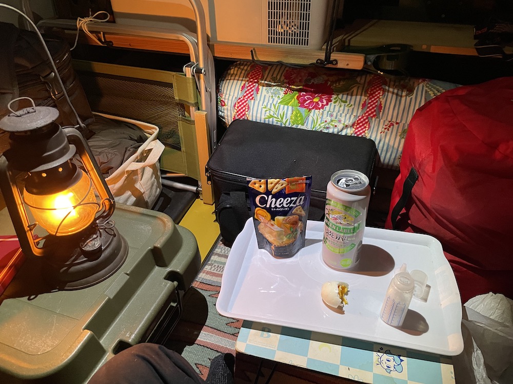 この晩も外気温は3°Cくらいで結構風も強かったけど、硬い壁でしっかり風からも守られていることと、オイルランタンの仄かな灯りがささやかな暖房となって逆にウキウキした気分になってしまい、1人宴会をした後は当然電気毛布も暖房もないけど暖かい寝袋にくるまって快眠しました。
