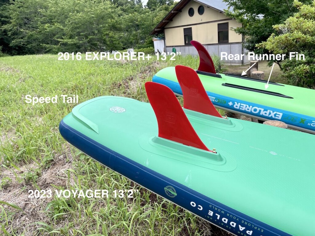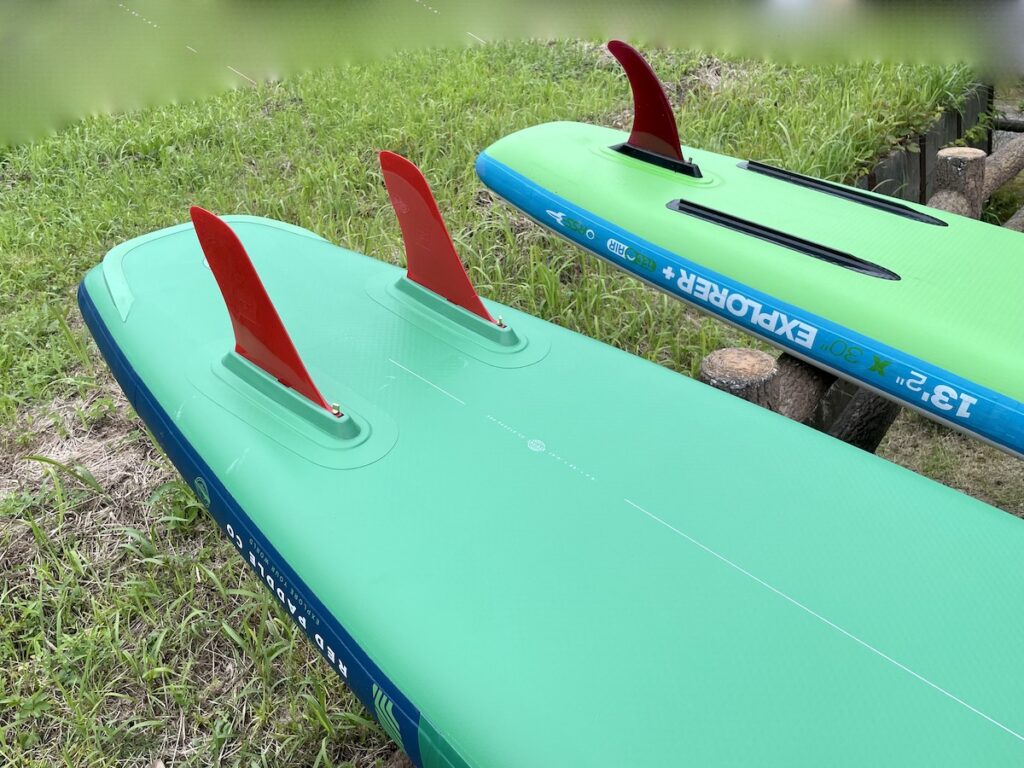 私が使い始めたのも確か2016年モデルからなのですが、ちょうど中古で売りに出ている2016年のEXPLORER+ 13’2″をお預かりしているところだったので、それをお借りし、V-HulllとSpeed Tailの有無、シングルフィン + リアランナーフィン対ツインフィンの違いなどを、違いのわかりやすい静水面で乗り比べて試してみることにしました。